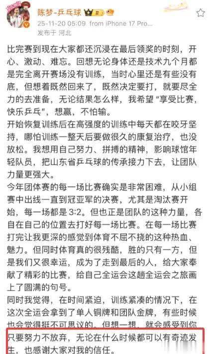 不过陈梦始终坚守在体育领域,她曾在采访中明确表示,自己的核心还是乒乓球,参与综艺和商业活动只是想让更多人关注体育、热爱体育。