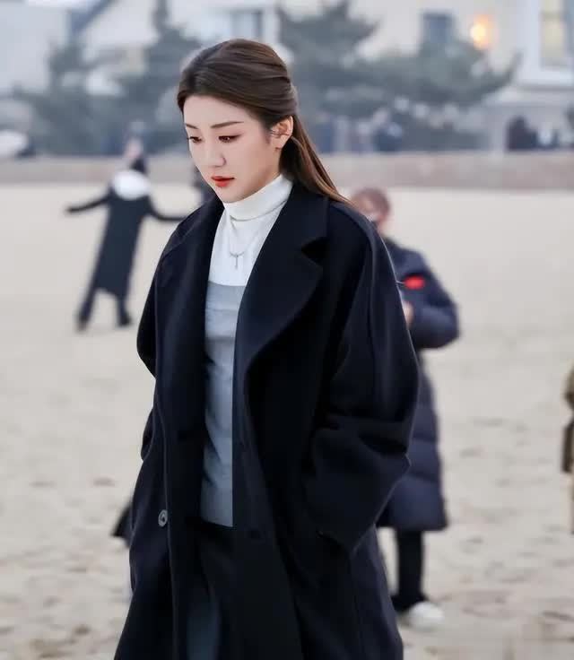 她身着一件黑色大衣,简约大气的版型衬得身形高挑匀称,内搭浅色系高领打底。
